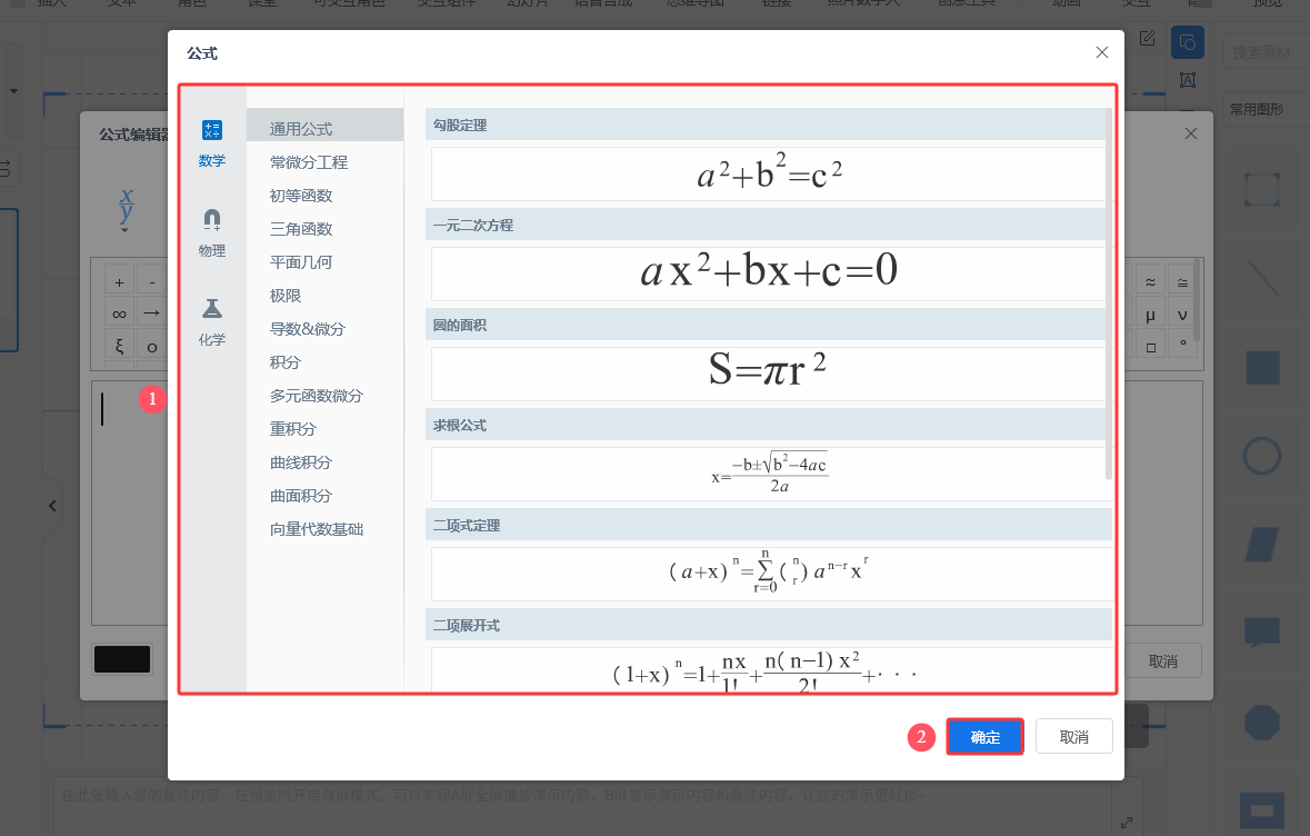 在這里已經(jīng)預(yù)設(shè)好了很多數(shù)學(xué)公式、物理公式和化學(xué)公式,選擇需要的公式進(jìn)行添加即可