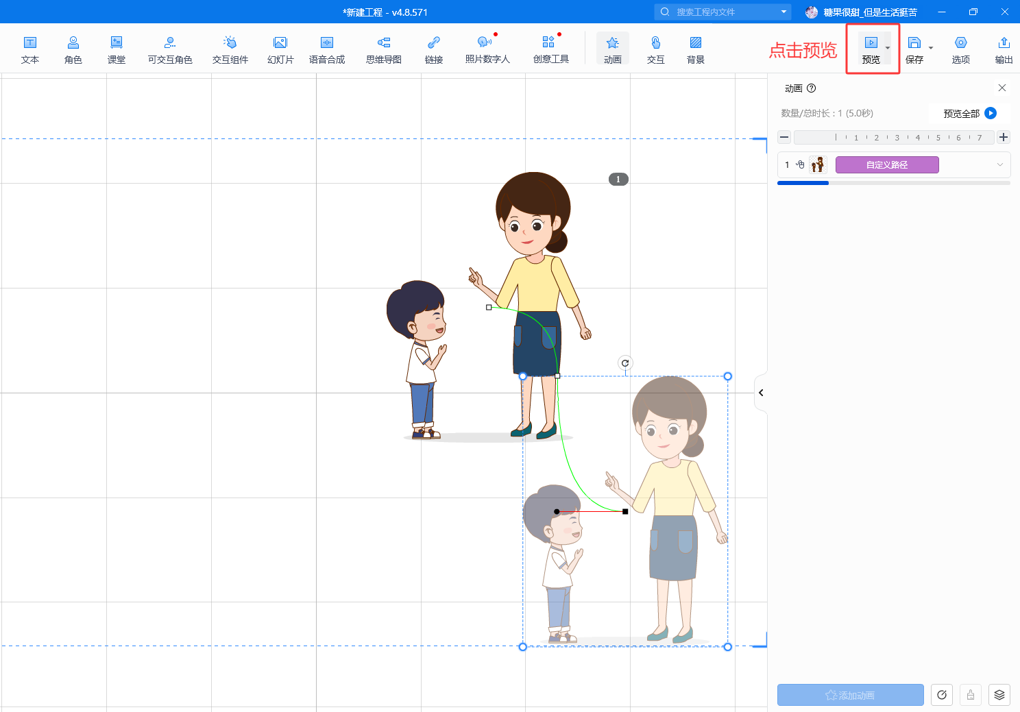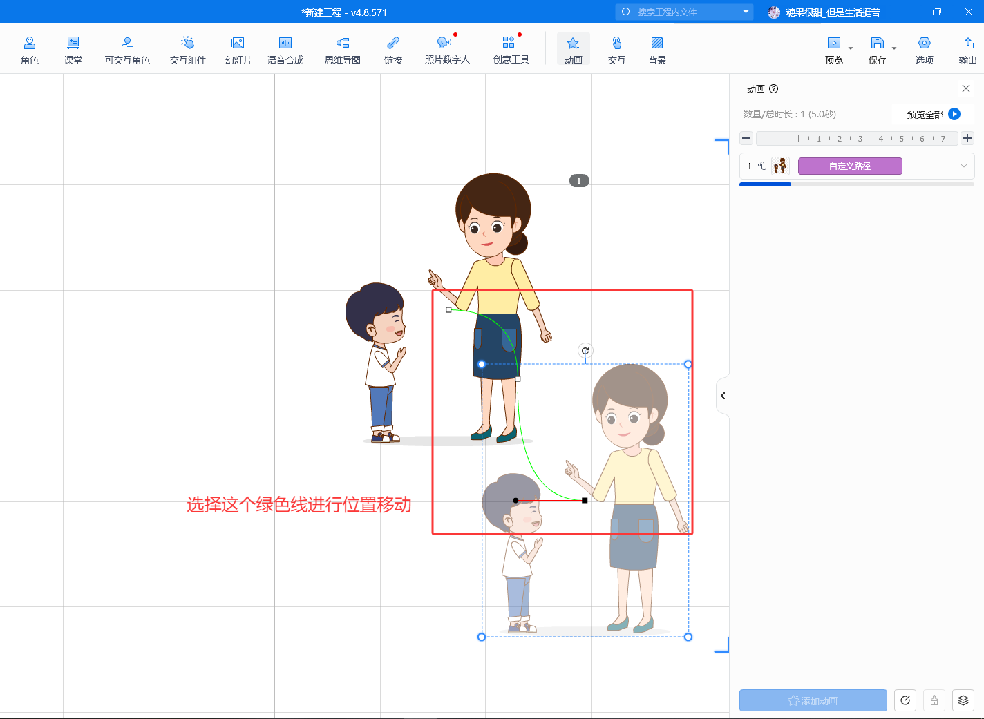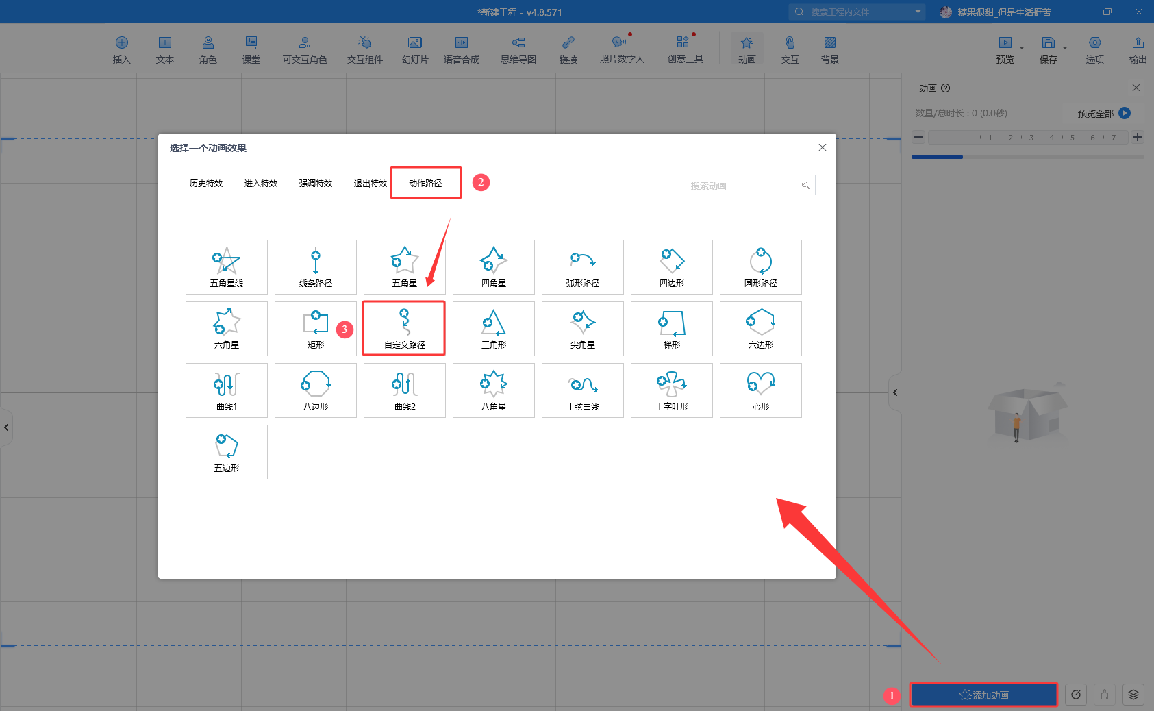 2 單擊需添加路徑的物體,點擊【添加動畫】彈出默認窗口選擇【動作路徑】,選擇【自定義路徑】,開始自定義編輯。